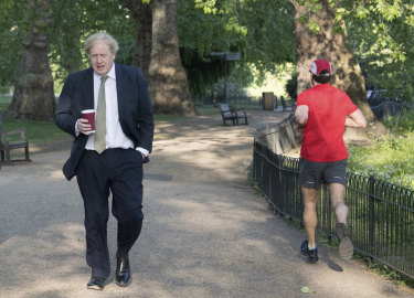 Britain's Prime Minister Boris Johnson takes a morning walk at St James's Park in London before returning to Downing Street, Wednesday May 6, 2020.Credit:PA