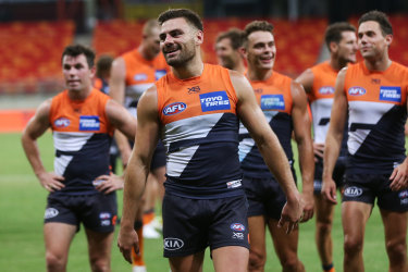 Giants captain Stephen Coniglio leading his team off the field after their AFL round one win over Geelong in March, 2020.Credit:AAP
