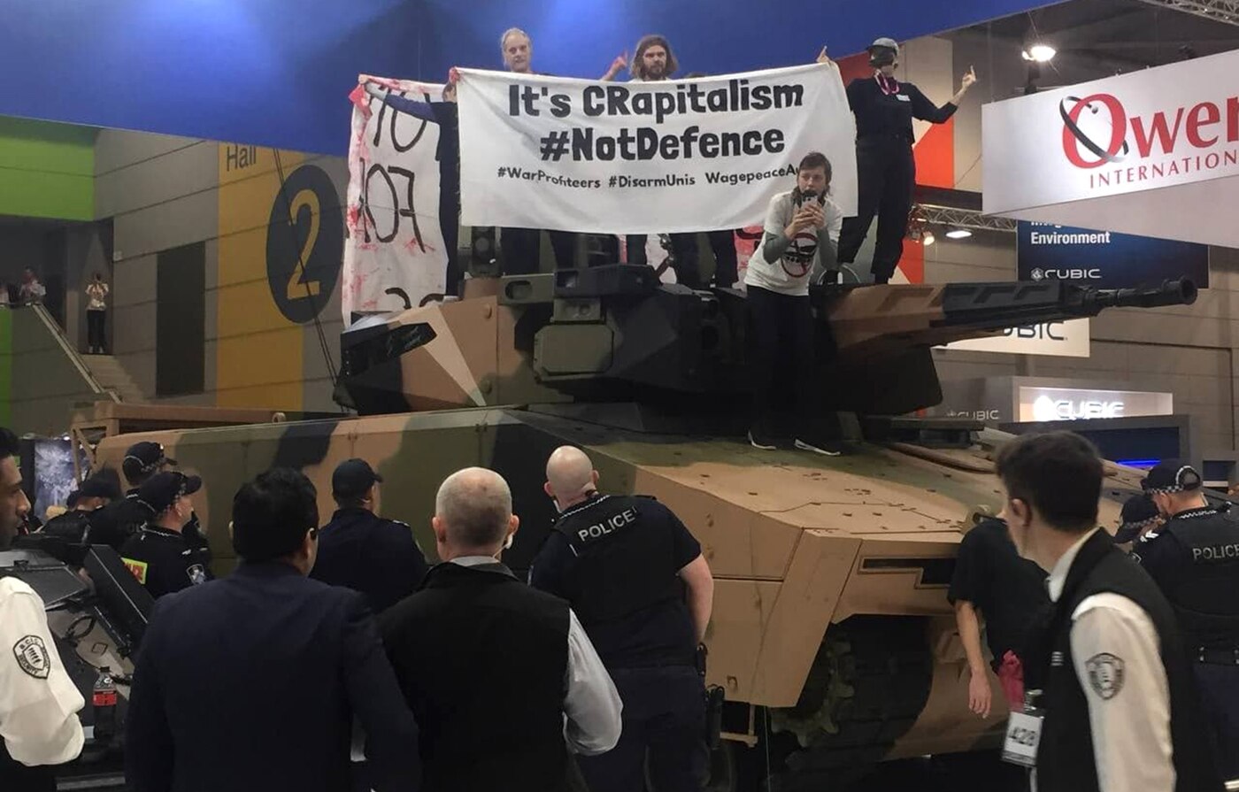 About 20 protesters got inside the Land Forces Australia expo at the Brisbane Convention and Exhibition Centre and several climbed onto a tank that was on display.