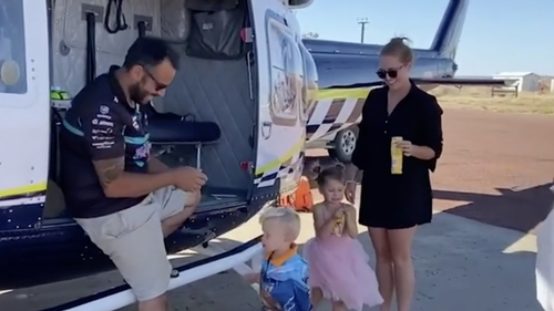 The family was handed drinks and ice blocks after they touched down in the SA town of in Coober Pedy.