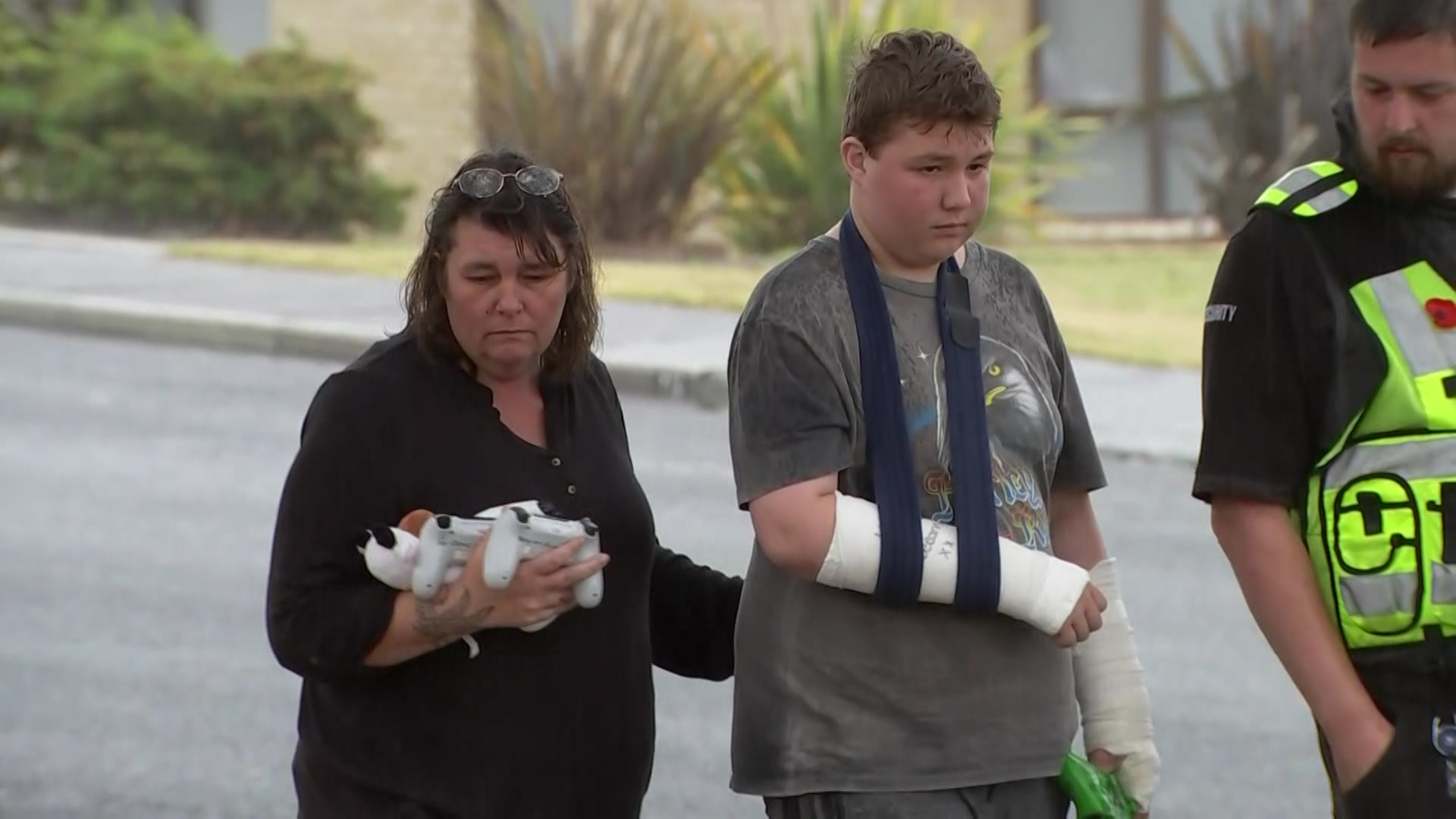 With both arms in bandages, Beau was supported by his mum Tammy as they laid gifts of gaming controllers and soft teddies in memory of his friends.