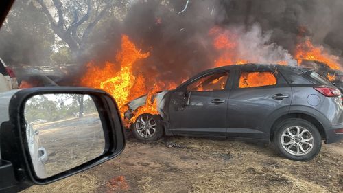Photos showed one car up in flames, with multiple others in dire straits as the fire raged nearby and thick plumes of smoke billowed into the air.