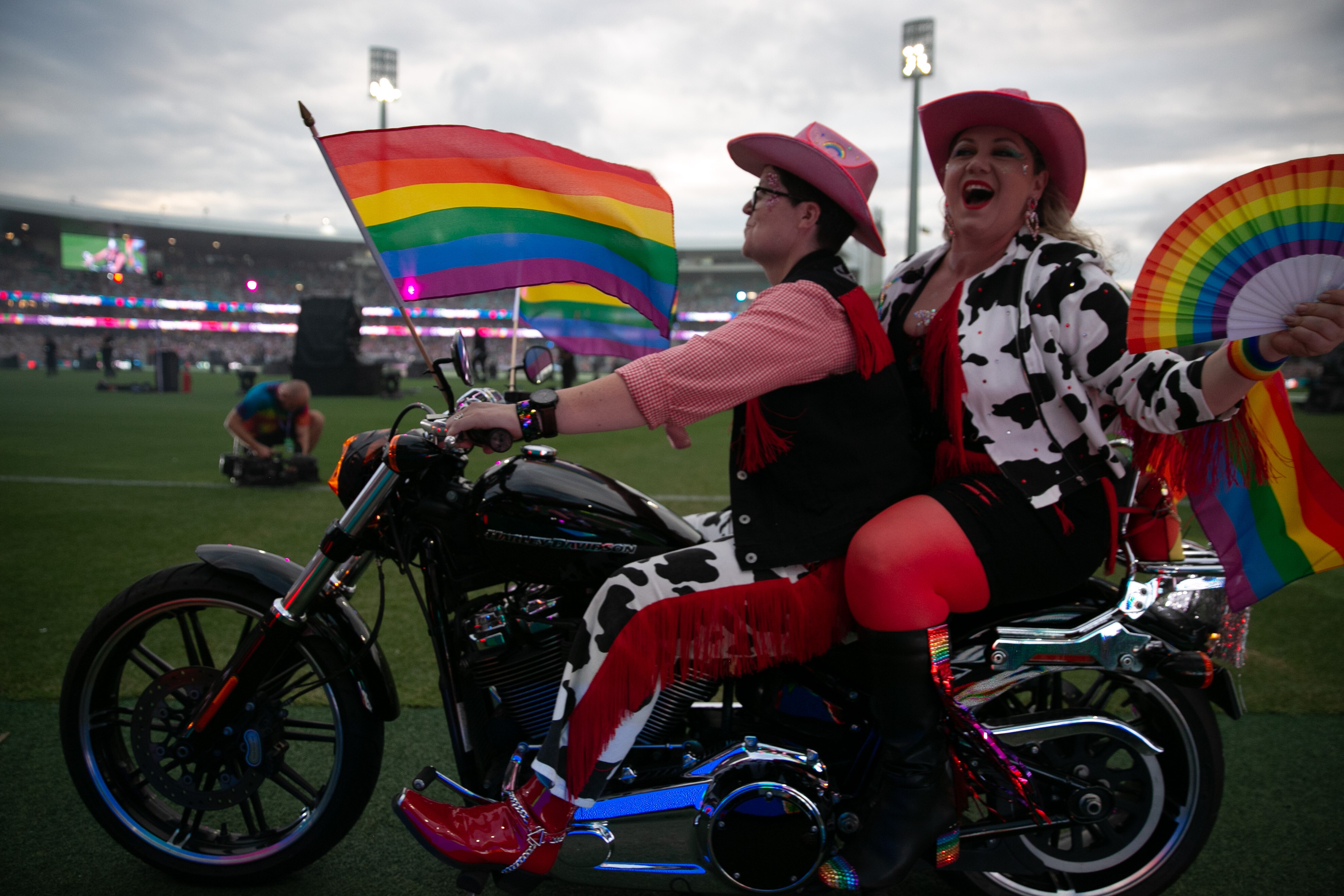 Fire sparked around the Dykes on Bikes, who were the first to roll onto the stadium, with lights flashing and ominous music blaring, before Pink's hit So What started playing.