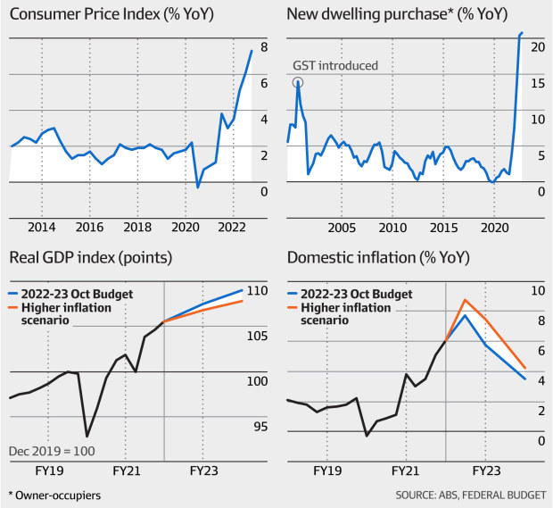 “Under this scenario more persistent inflation is assumed to lead to a higher peak in interest rates than currently expected. Higher inflation and interest rates would lower real household disposable income,” the budget said.