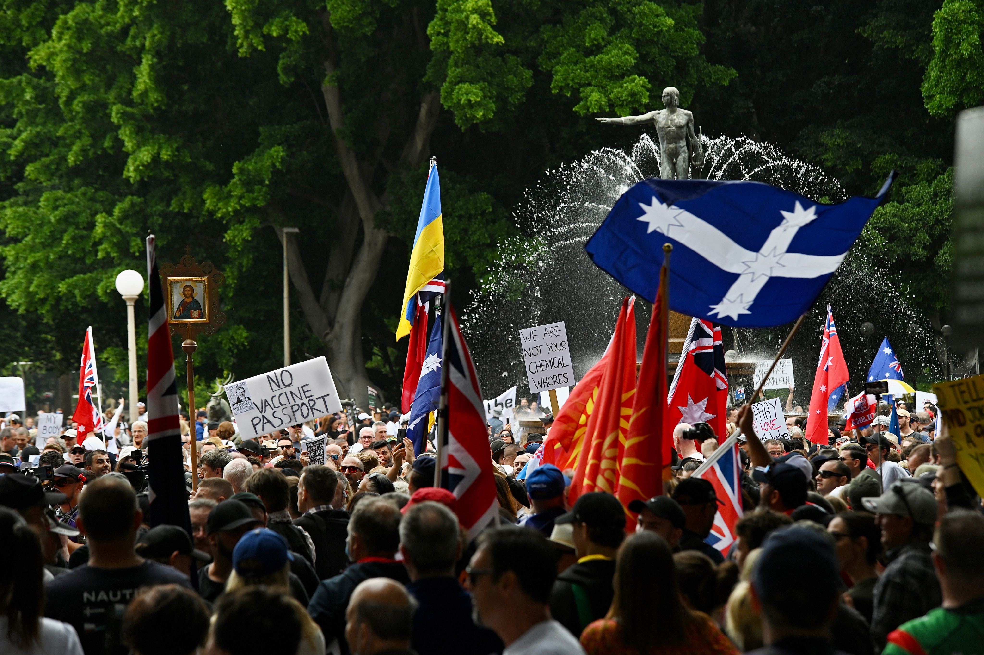 More than 60 people were arrested at the event after they marched from Broadway to Town Hall and breached the strict public health orders in place at the time.