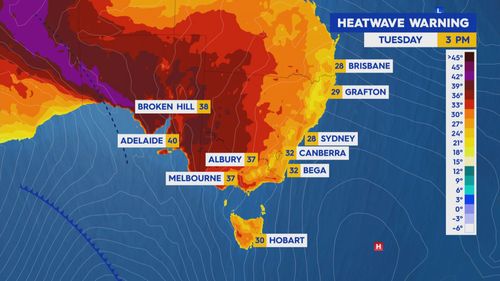 "The heat will peak over most parts on Tuesday as maximum temperatures reach forty over southern inland parts."