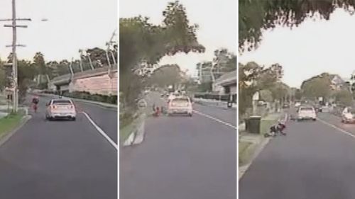 A stunned Clarke can be seen on his hands and knees on the road as his bike is dragged away in footage captured by another motorist's dashcam.