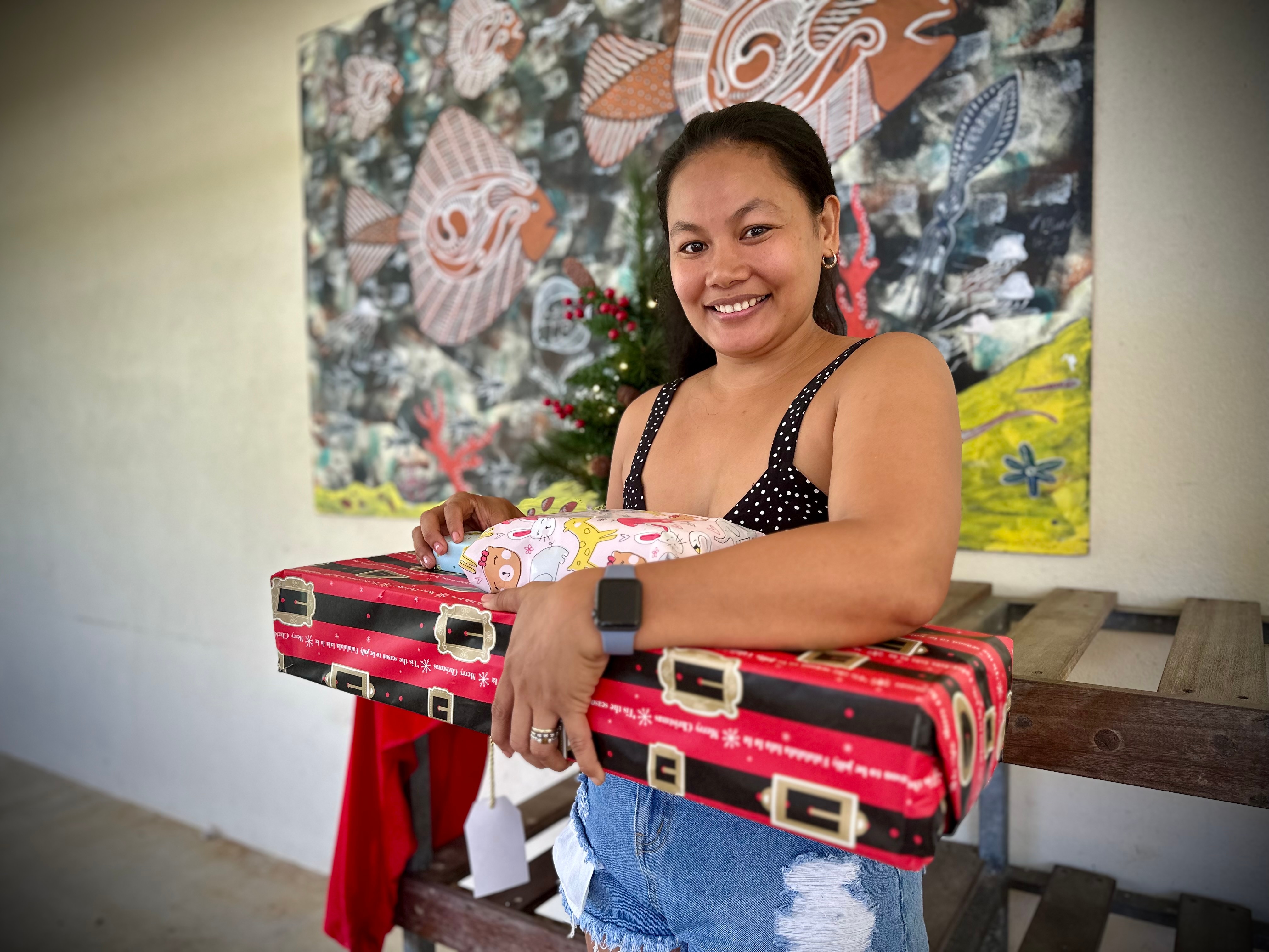 On Saturday, she went to Machans Beach State School to collect a present for her son, part of a community present drive to ensure flood-affected children still had something to open on Christmas Day.