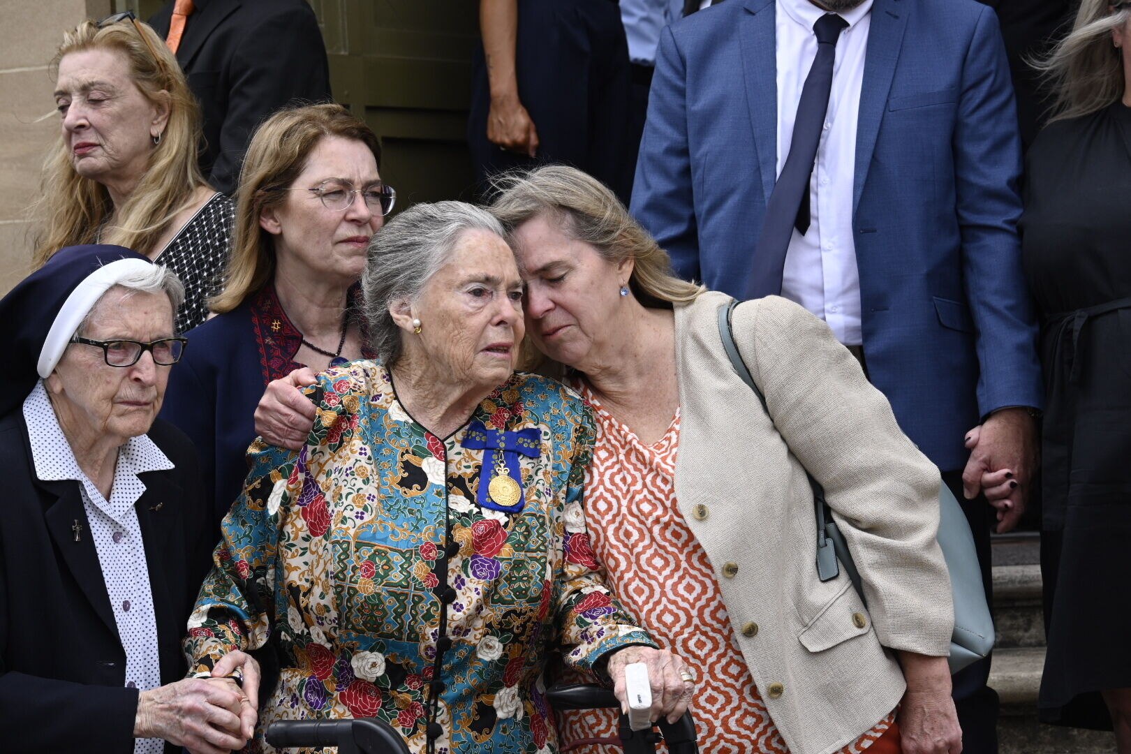Dallas Hayden (centre), seen here at her husband's funeral, is survived by her three children, Georgina, Kirk and Ingrid.(ABC News: Kenji Sato)