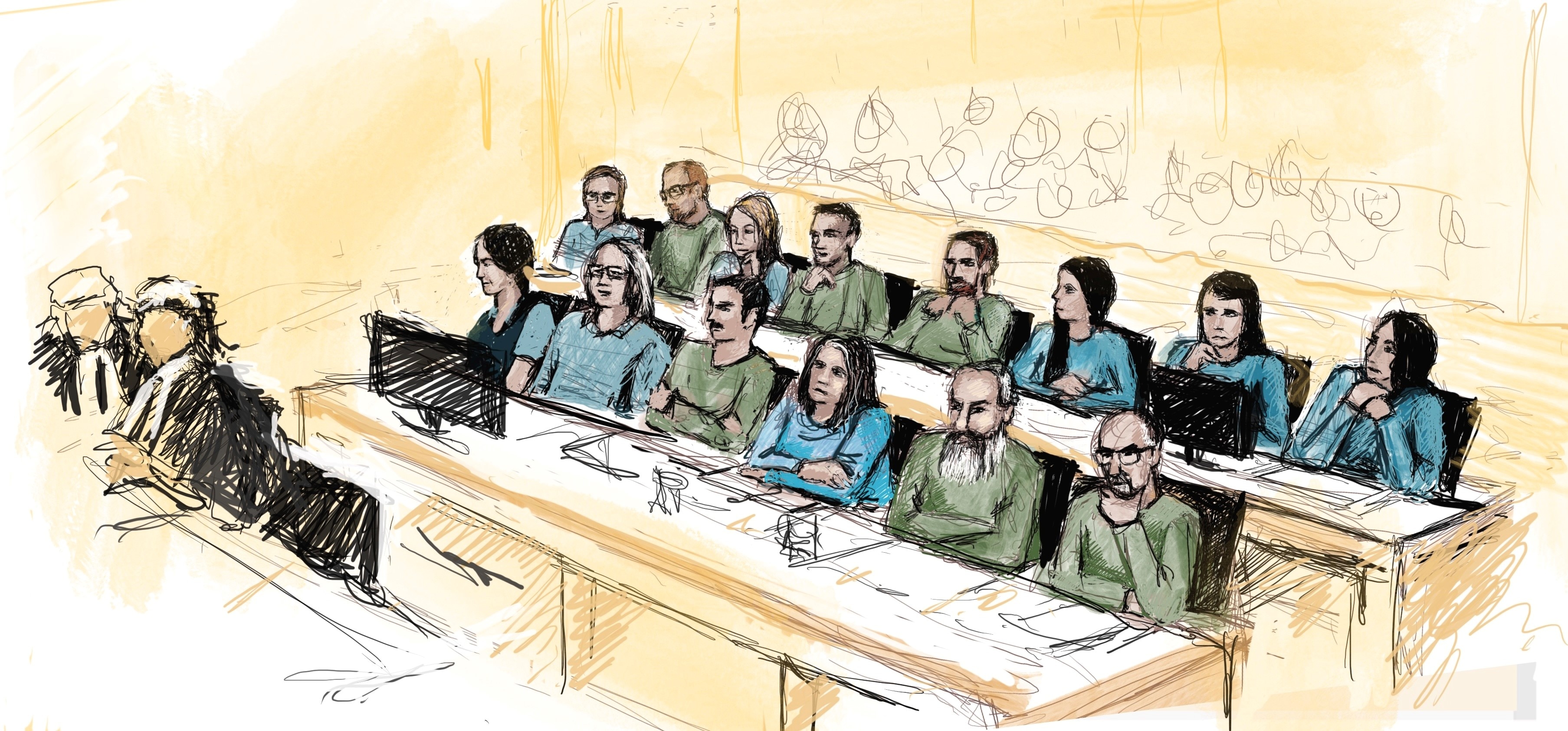 Because the group have chosen not to have lawyers, they are sitting at specially constructed bar tables in the court room and not in the dock area normally reserved for prisoners.